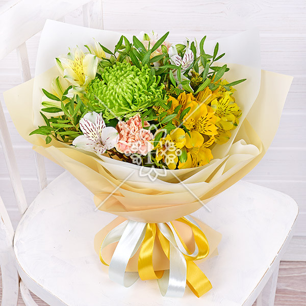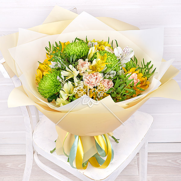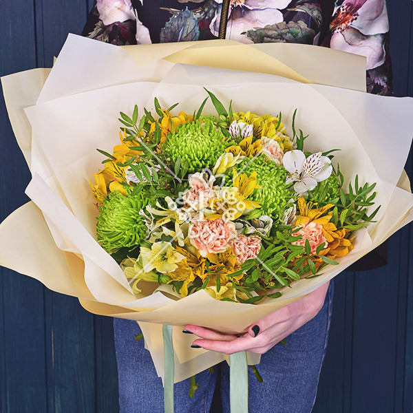 хризантема зеленая одноголовая – 1 шт., альстромерия желтая – 3 шт., альстромерия белая – 1 шт., гвоздика персиковая – 2 шт., зелень декоративная (фисташка), упаковка, лента.