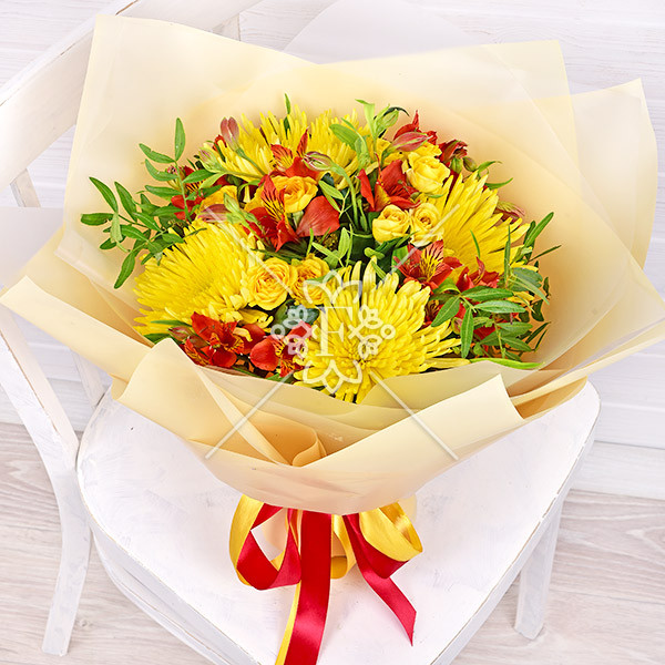 роза желтая кустовая – 1 шт., хризантема желтая одноголовая – 2 шт., альстромерия красная – 2 шт., зелень декоративная (фисташка), упаковка, лента.