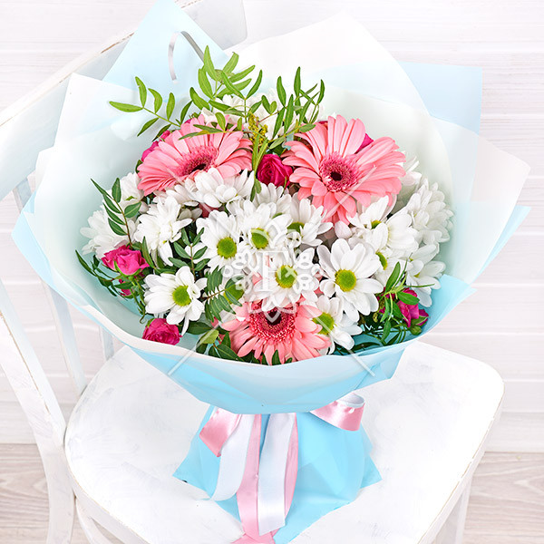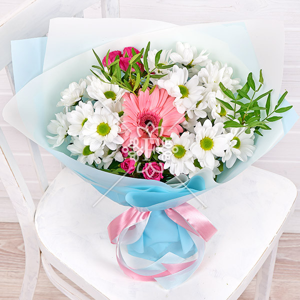 роза розовая (малиновая) кустовая – 1 шт., хризантема белая кустовая – 3 шт., гербера розовая – 1 шт., зелень декоративная (фисташка), упаковка, лента.